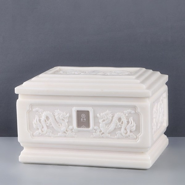 先说玉石类骨灰盒,价格比较便宜,从几百元到几千元都有,主要材质是汉白玉。另外,可以在骨灰盒上进行雕刻。题材以动物和植物为主。